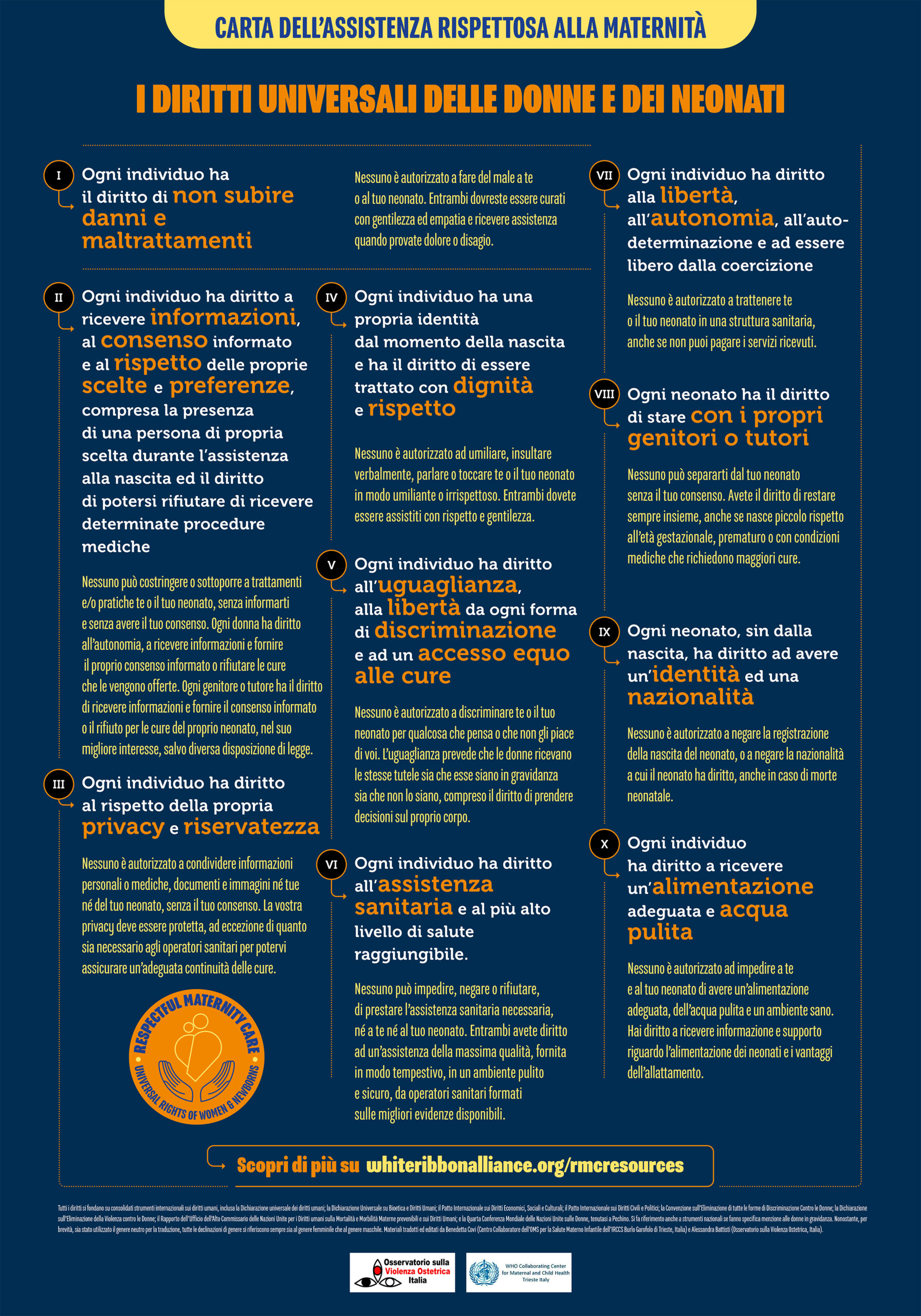 La “Carta dell’assistenza rispettosa della maternità: i diritti universali delle donne e dei neonati” affronta la mancanza di rispetto e gli abusi vissuti dalle donne, dai neonati e dalle famiglie durante l’assistenza materno-neonatale ed esplicita chiaramente i diritti di cui le donne e dei neonati sono titolari durante l’assistenza loro erogata all’interno di una struttura sanitaria in gravidanza, nel parto e nel post parto.